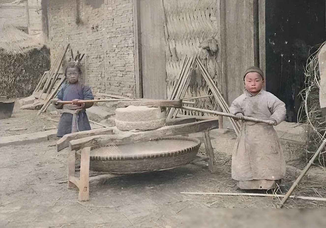 还有这张,小男孩拉着磨,看着就让人心疼。那么小就要干活,这日子怎么过呀?不过话说回来,那时候的孩子们都挺早熟的,从小就懂得分担家庭的重担。这点倒是挺让人佩服的。