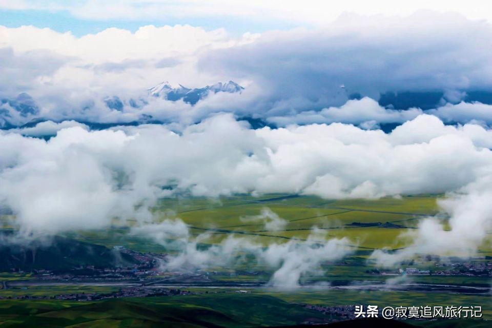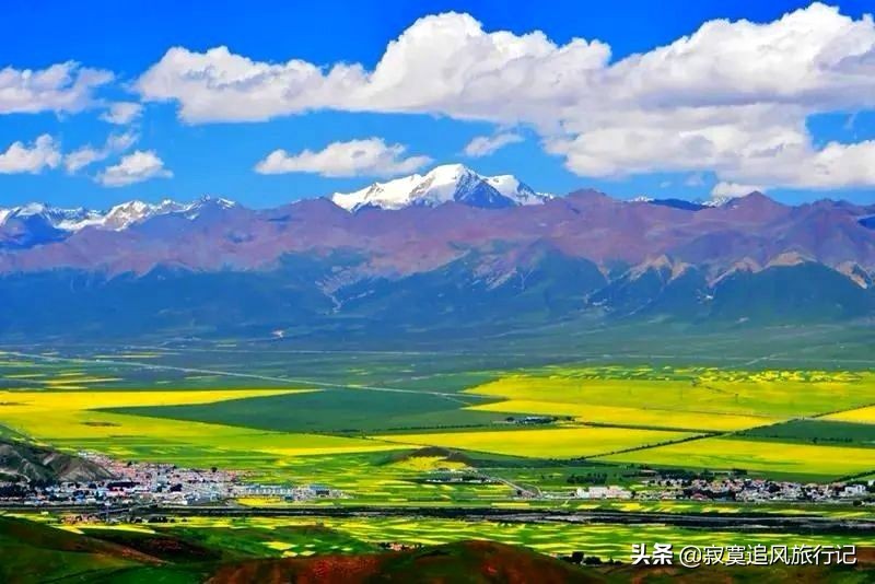 5. 门源县水泥厂对面的南山上,这里能观赏油菜花全景和常年积雪不化的冷龙岭及岗什卡雪峰,需要爬山,约 40 分钟。