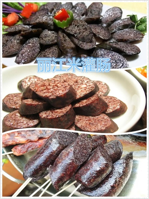 丽江小吃米灌肠是纳西族的传统食品。米灌肠分为黑米灌肠和白米灌肠两种。