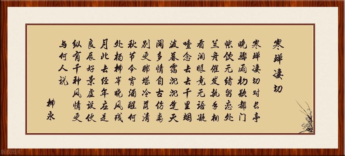 寒蝉凄切,对长亭晚,骤雨初歇。都门帐饮无绪,留恋处,兰舟催发。执手相看泪眼,竟无语凝噎。念去去,千里烟波,暮霭沉沉楚天阔。
