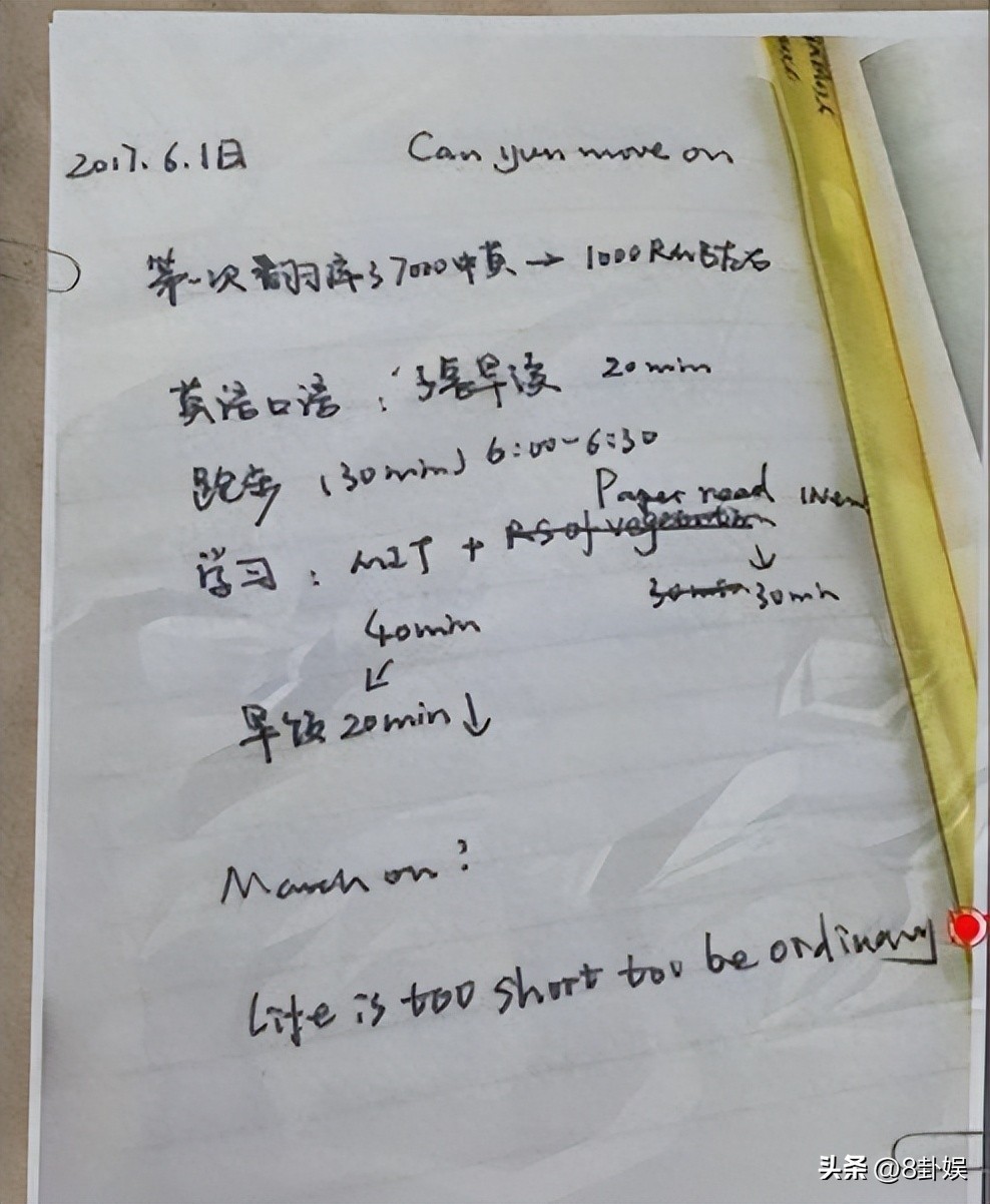 章颖莹的日记上可以看到小女孩对待生活的热情和努力精神,“第一次翻译中英文赚了一千人民币,早上起来练了二十分钟的口语,从六点开始跑到六点半,加油!”。