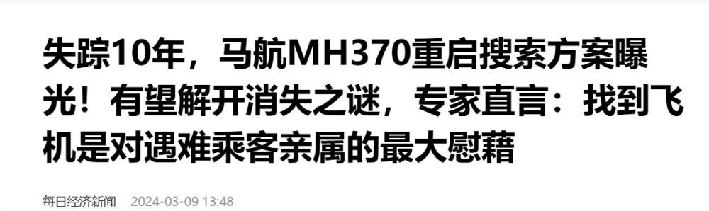 每日经济新闻2024-03-09 13:48《失踪10年,马航MH370重启搜索方案曝光!有望解开消失之谜,专家直言:找到飞机是对遇难乘客亲属的最大慰藉》