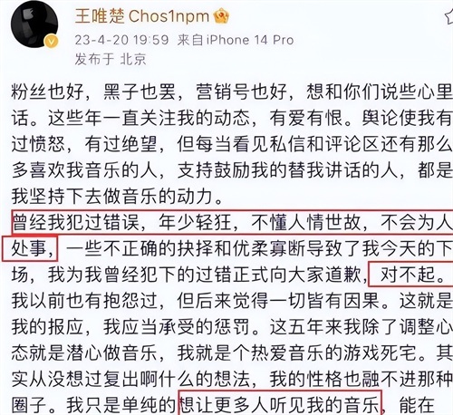 对当年的事情他也表示了再次的抱歉,讲述了自己的错误和对自己未来的期望。