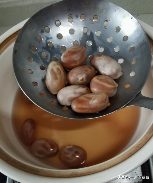 然后关火,这时煮菠萝蜜的水已发红,将菠萝蜜核盛出,放入碗中。