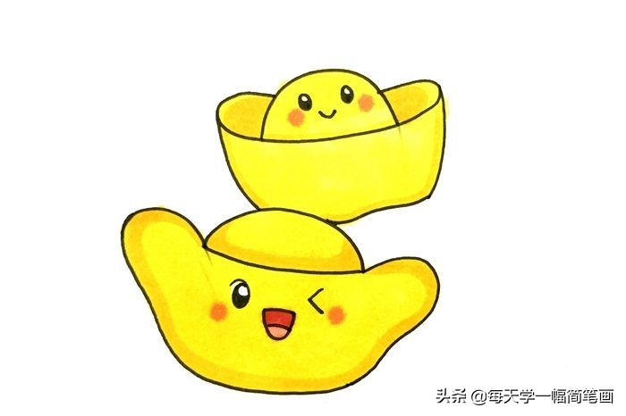 首先我们画出一个金元宝,形状是两头尖尖,中间凸起,按照同样的画法再画一个元宝出来,并给两个元宝画上可爱的表情,然后就可以涂色了,给元宝涂上金黄色,边缘涂深黄色,并画上腮红,卡通元宝简笔画就完成了。