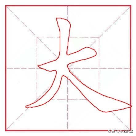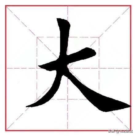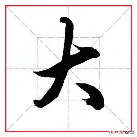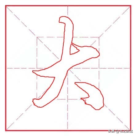 横画斜切入笔,然后向右大抗肩上行,粗细变化较小,凡是下面有撇捺者,横画的抗肩角度都较大;竖撇高起,先竖后撇,起笔角度略平,向下略轻,稍左斜,从横画的中间偏左处穿过,随后稍给力写出撇肚,过撇肚后向左运笔拐弯快速撇出,力达撇尖,不可出现鼠尾;最后捺笔舒展飘逸,位于横与撇的交叉稍偏下位置处从撇画里面藏锋起笔,顺势向右下行,行笔渐重,到捺脚处稍顿再向右缓提笔锋收笔,捺脚低于左撇撇尖,出锋要平。