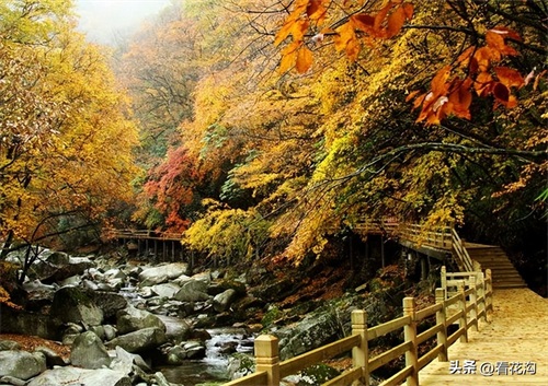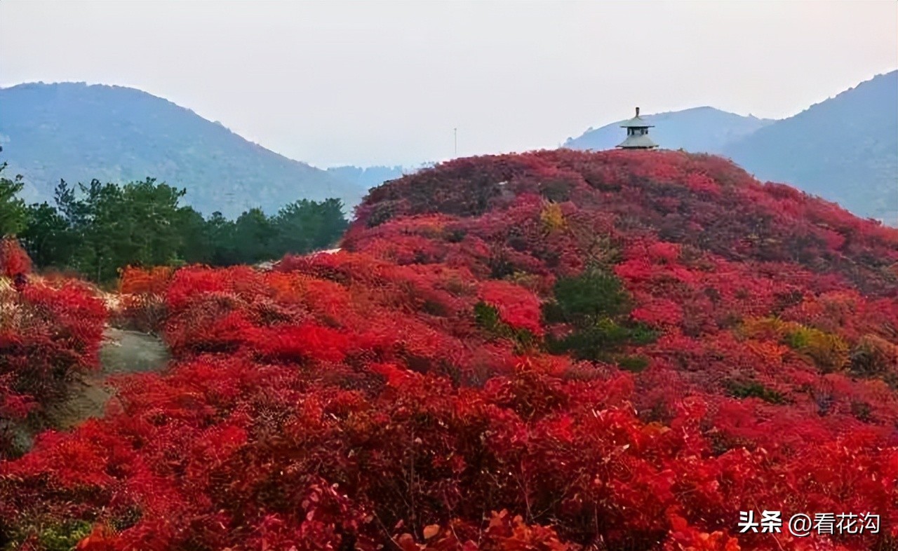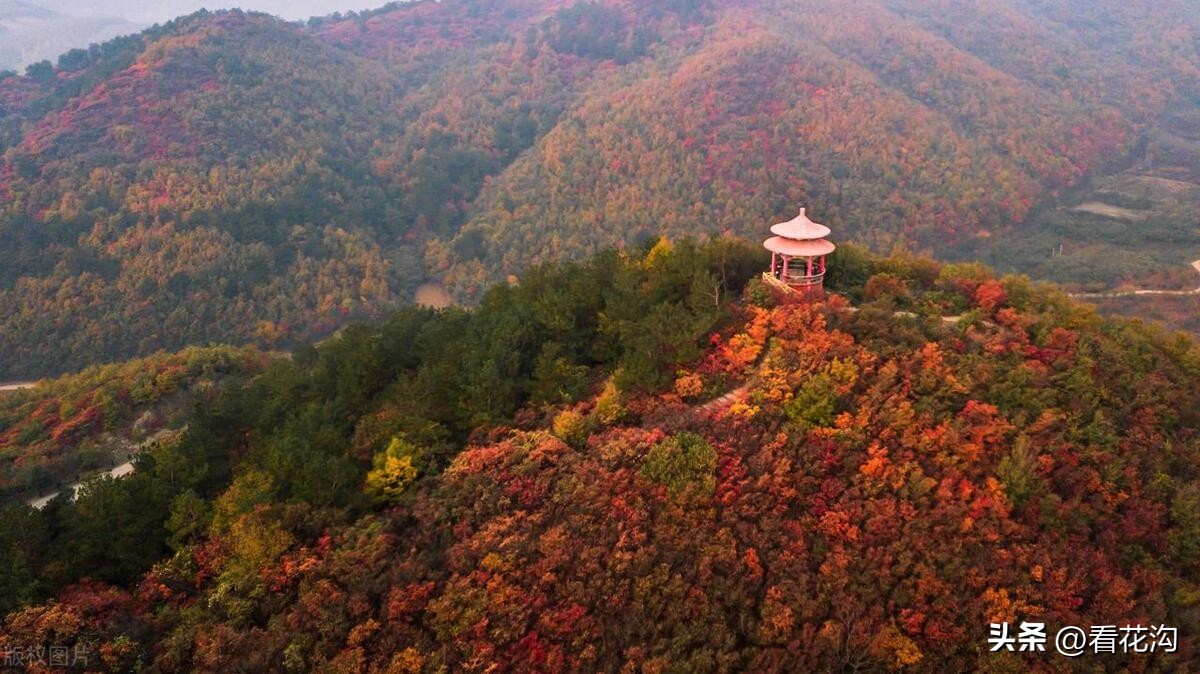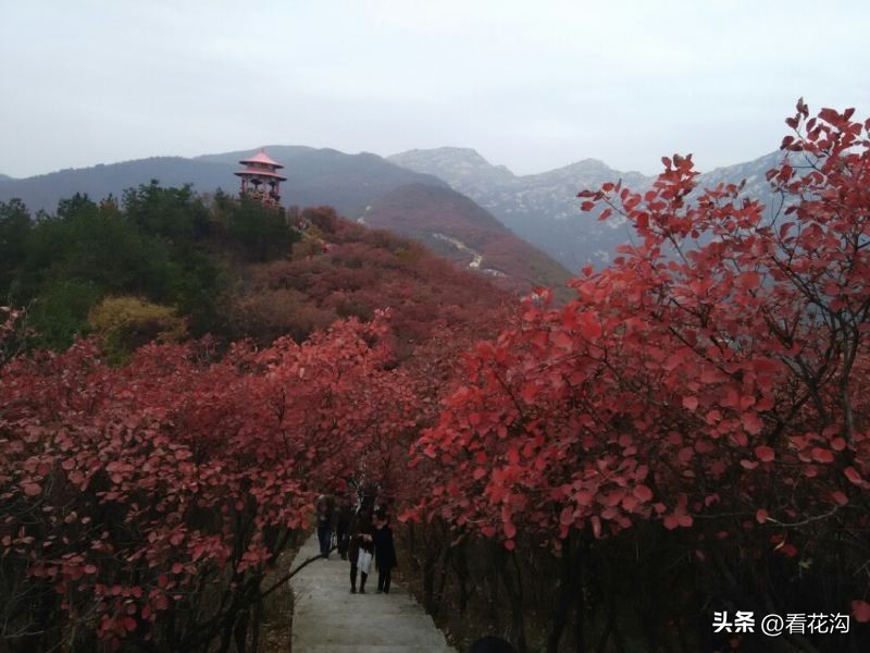 18.桐柏县的著名景点-黄岗红叶园。位于桐柏县东北部,北出黄岗镇街区12公里,从县城出发一小时即可到达。景区内怪石嶙峋,层峦叠嶂,沟壑万丈,野生动植物种类繁多。其中红叶资源占30余平方公里,分布在连绵数十里的山岭沟壑间,为桐柏一大特色旅游景观,有中原“红叶之都”的美誉。黄岗红叶,主要由黄栌树所生,间有野枫、柿树、木梓树等树种,分布在海拔500米以下的山体。春则翠如鹅黄,夏则墨绿浓郁,秋则层林尽染,红叶灿若朝霞,铺天盖地,间有青松点缀,整个山体锦绣璀璨,如同美女红裙束身,煞是惹人心醉。森林藤蔓里还有300多个奇异景点,如盘古奶卧像、情人石、狮子峰、仙浴池、古乐洞,每年10月底-11月底是观赏红叶的最佳时期。