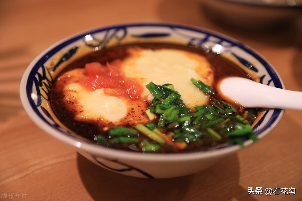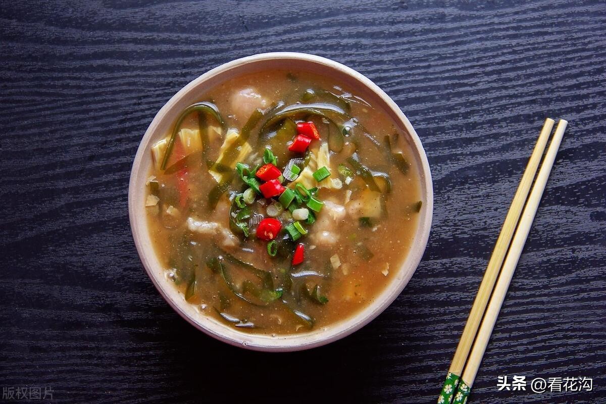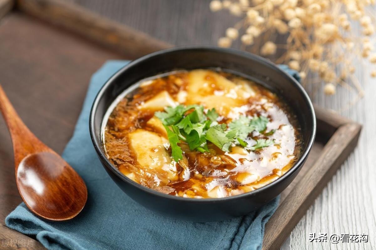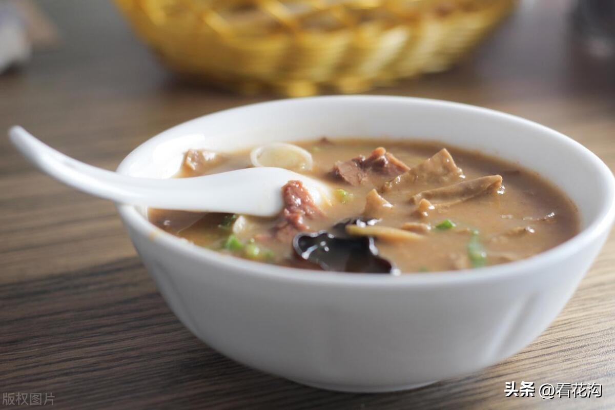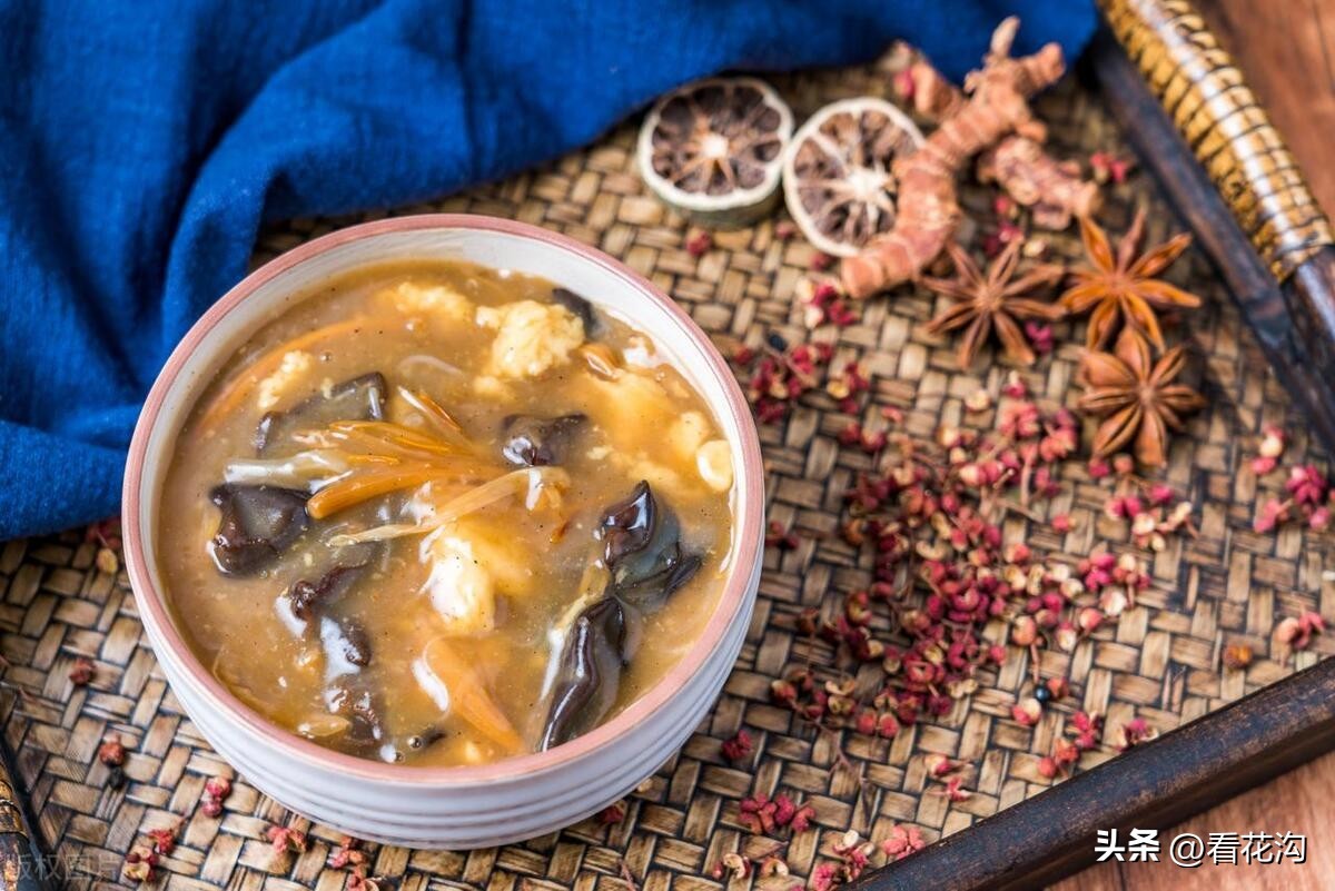 34.桐柏县的著名小吃-桐柏糊辣汤。又叫八珍汤,叫八珍自然夸张,不过这也说明糊辣汤“内容”很多。最常见的有面筋、海带丝、粉丝、千张丝、花生米、香菜、姜末、榨菜、胡椒粉等。根据节令和地域的不同,还会有牛(羊)肉、黄豆、木耳、黄花菜、菠菜、萝卜条、葱花等。做法很繁琐,先用淡盐水和面,揉成面团,然后不断加水“洗”出面筋。水烧开后下面筋,面筋熟后将洗面筋的水,也就是稀淀粉糊倒入锅内,小火烧至汤汁粘稠,再放入其他配料,旺火烧沸。胡辣汤盛到碗里后,加榨菜,淋香油、香醋等,喝起来粘乎乎、香喷喷。