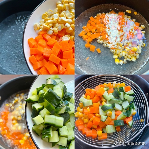 放入玉米粒、胡萝卜丁、青瓜粒炒匀
