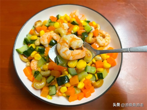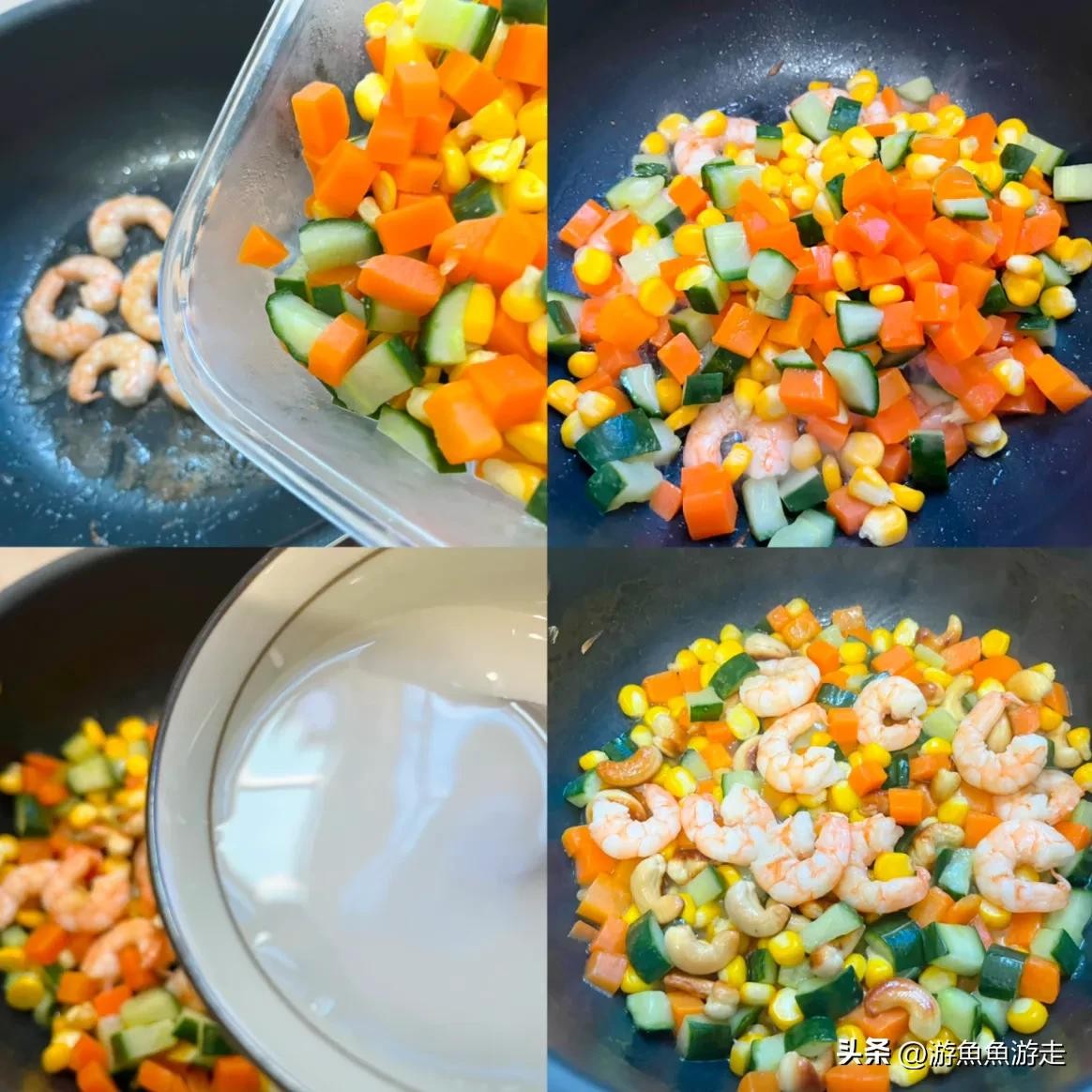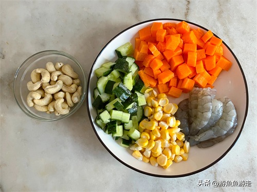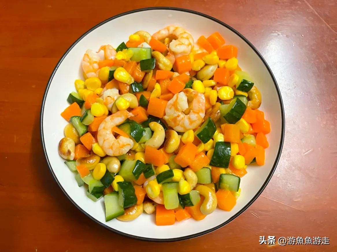 食材:虾仁、玉米、胡萝卜、青瓜、腰果