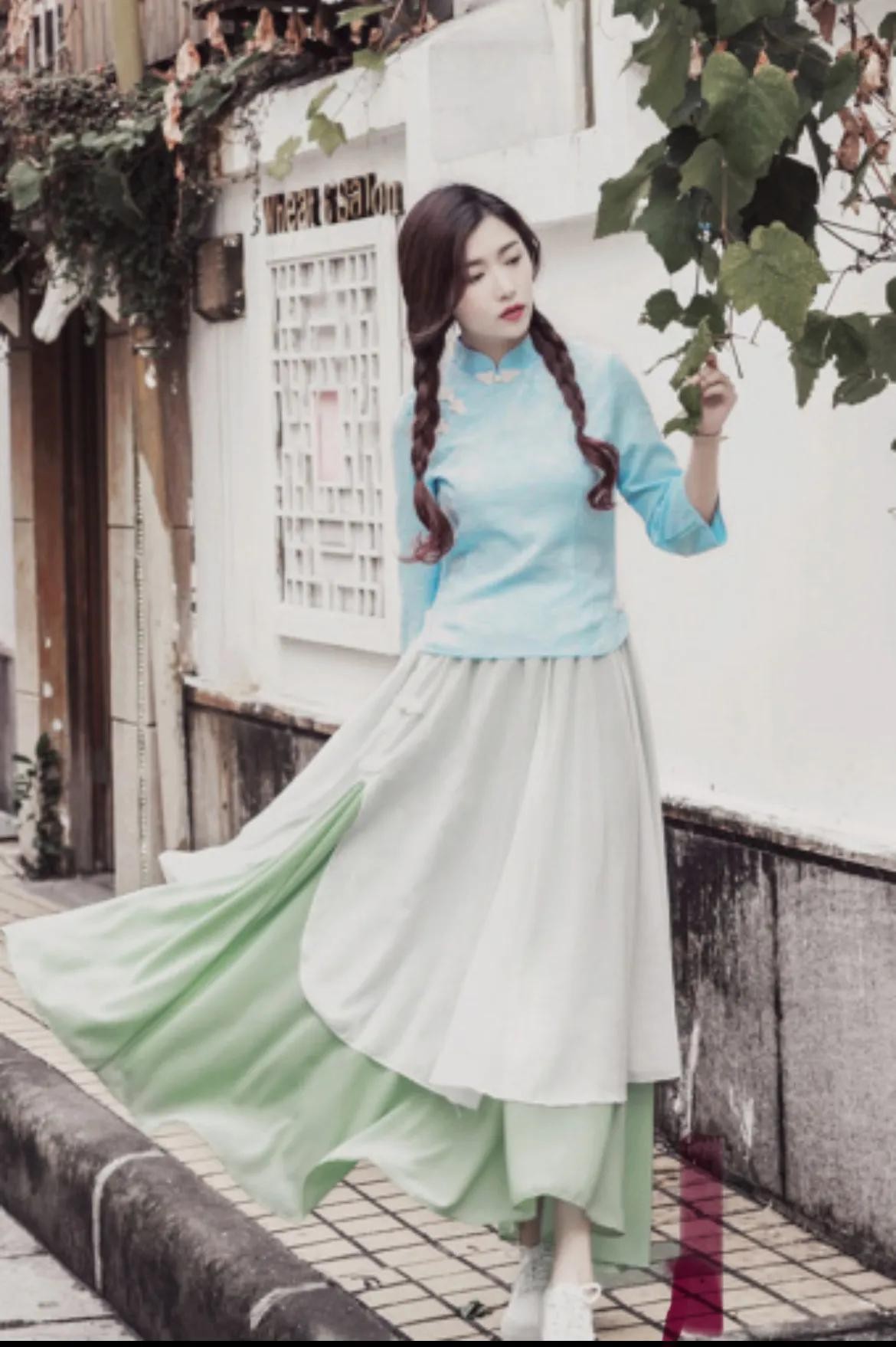 而上衣下裙的搭配,则是另一种清新的旋律。对襟、斜襟的上衣,搭配着或长或短的裙子,展现出女性的灵动与活泼,宛如春日里的微风,轻盈而动人。