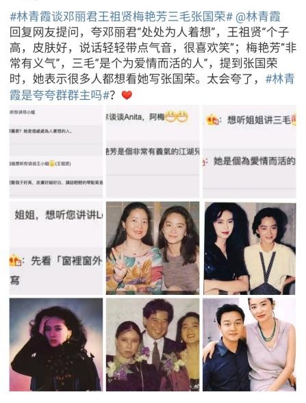 1月5日,媒体在社交平台上晒出了一组林青霞在评论区夸赞旧友的截图,并表示林青霞仿佛是夸夸群群主。