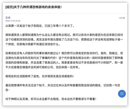 就在两年前,2020年8月份,一名ID为路茗居士的网友发了一篇《关于几种所谓恐怖游戏的十五年完结》帖子。他承认自己就是当年的左央,他的出现澄清了“左央事件”的始末。
