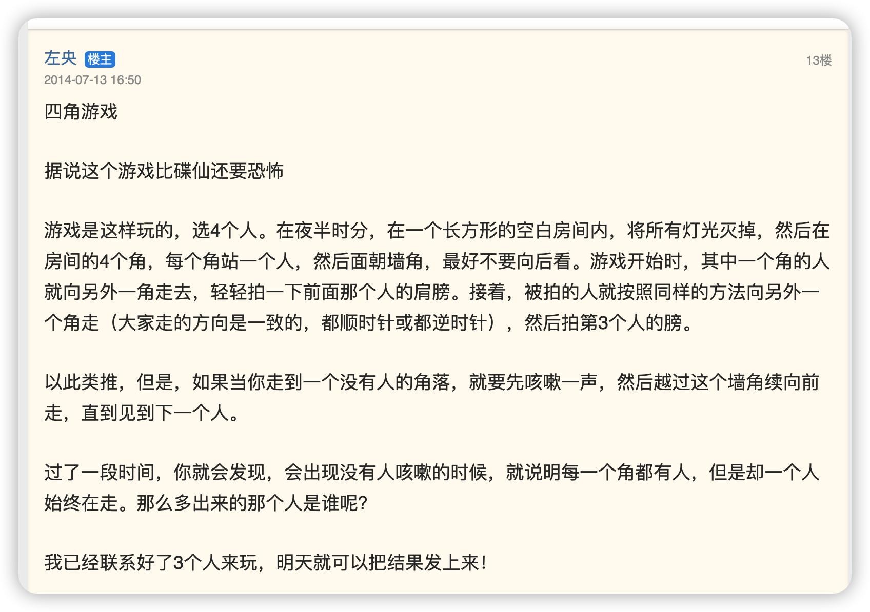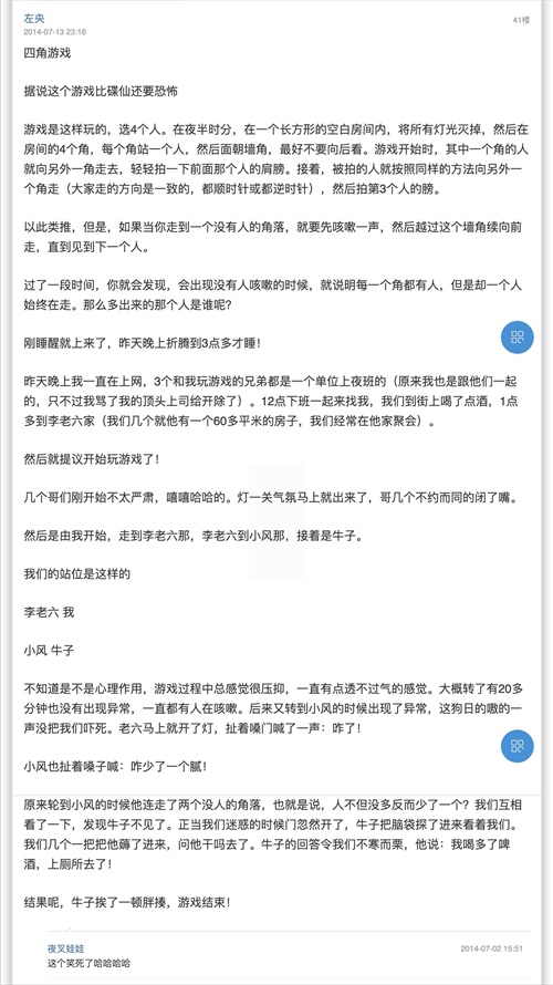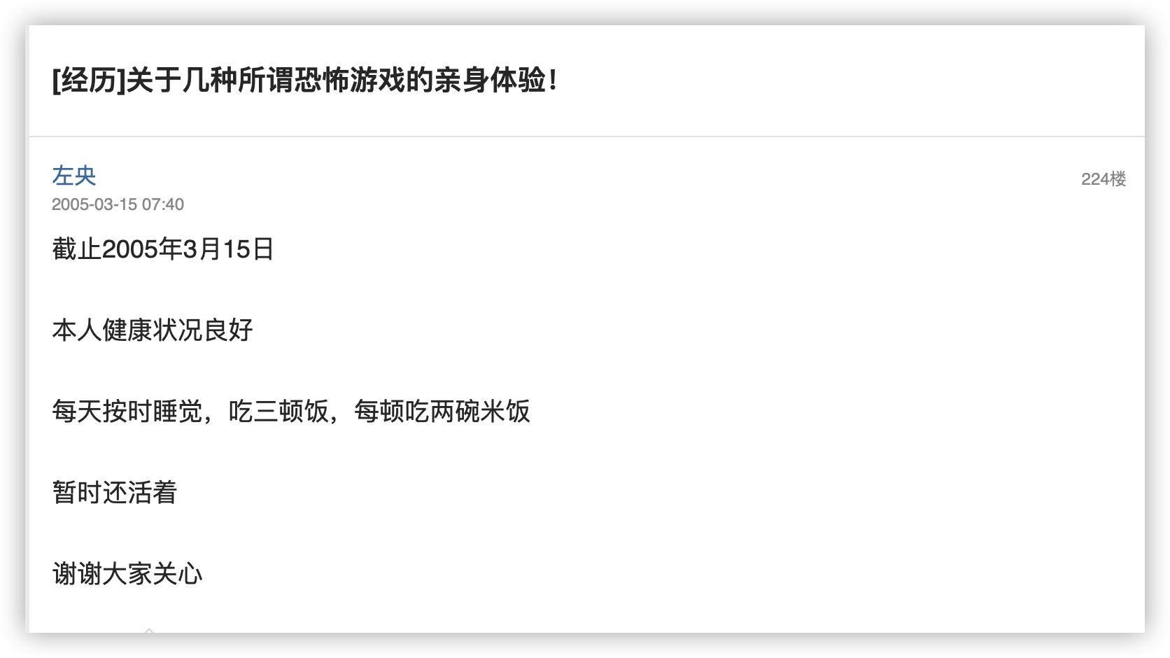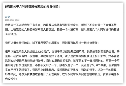 这又是一篇考古中文互联网的分享,故事最早发在17年前的2005年5月20日的天涯论坛莲蓬鬼话。大概说的是一名叫左央的网友发了一个名为《关于几种所谓恐怖游戏的亲身体验》的帖子,说自己亲身体验了这些游戏。
