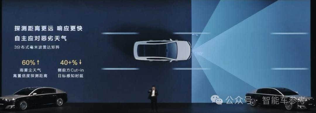 前向的3颗分布式毫米波雷达,在雨雾尘天气下有更远的探测距离。