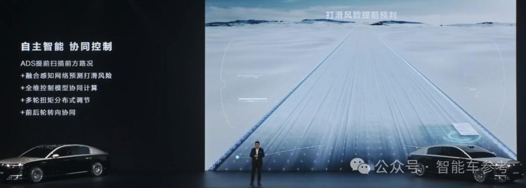 接着,余承东展示了搭载该技术车辆的操控表现。主要是针对过去传统豪华车的日常痛点,比如冰雪路面的失速打滑。