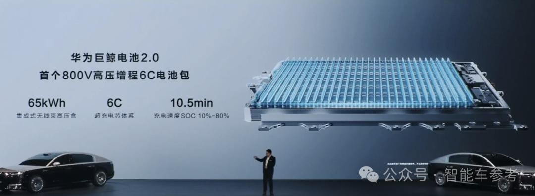 华为巨鲸电池2.0,支持800V高压,增程版电池包充电速率6C,10.5分钟从10%电量充到80%。
