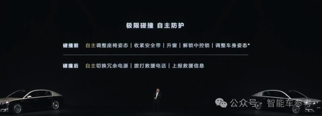 碰撞前后,车辆能自主调节车身姿态、车窗、座椅、安全带等等。