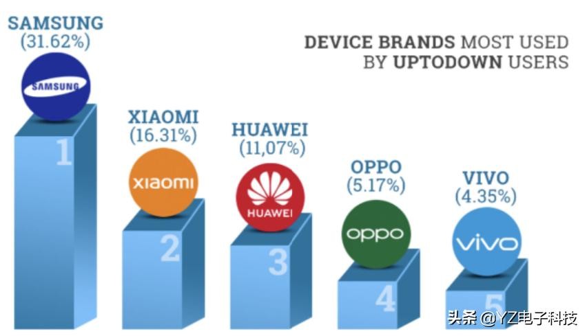 最受用户欢迎的前五大安卓手机品牌,依序为:三星(31.62%)、小米(16.31%)、华为(11.07%)、OPPO(5.17%)与vivo(4.35%)。