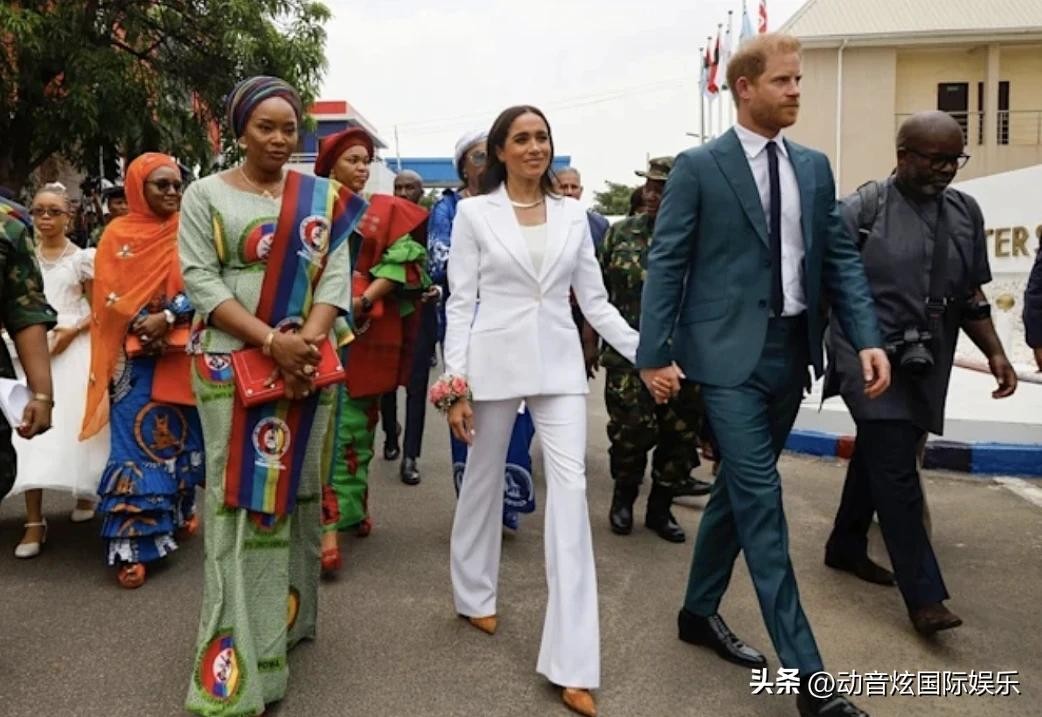 5月10日,他们到达了尼日利亚国防总部参加当天的第二场活动。梅根身穿一套白色定制西装,展现出优雅的风采。她穿着单排扣的西装外套,搭配合身的长裤和白色背心上衣,而哈里王子则身着深绿色的西装,英俊非凡。细心的王室粉丝迅速注意到,梅根和哈里的服装颜色恰好呼应了尼日利亚国旗的白色和绿色。