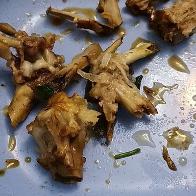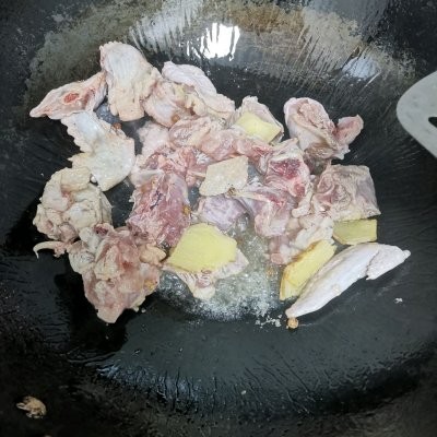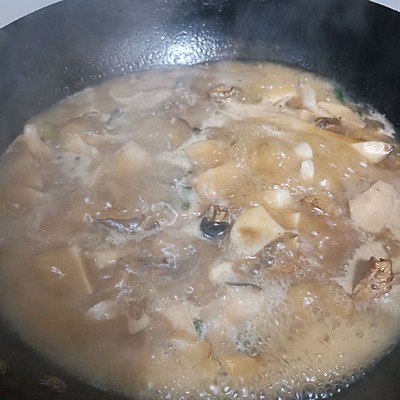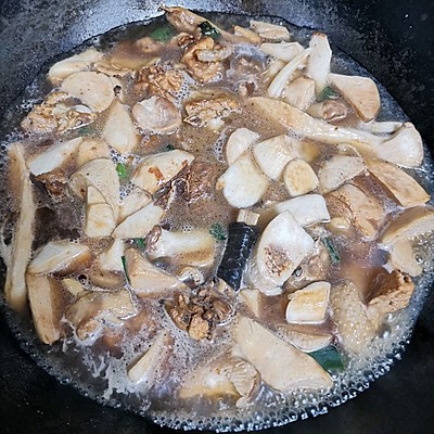 8、喜欢的配菜翻炒,香菇杏鲍菇都可以,我更喜欢香菇,今天没买到好的,加开水,没过鸡
