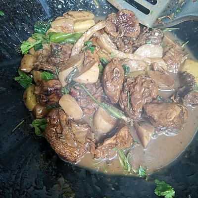 鸡 3/1只面粉 适量生姜 5g干辣椒 三四个八角 两个桂皮 一块香叶 三四片青红椒 2个生抽 一大勺老抽 适量耗油 半勺糖 一勺大葱 3g