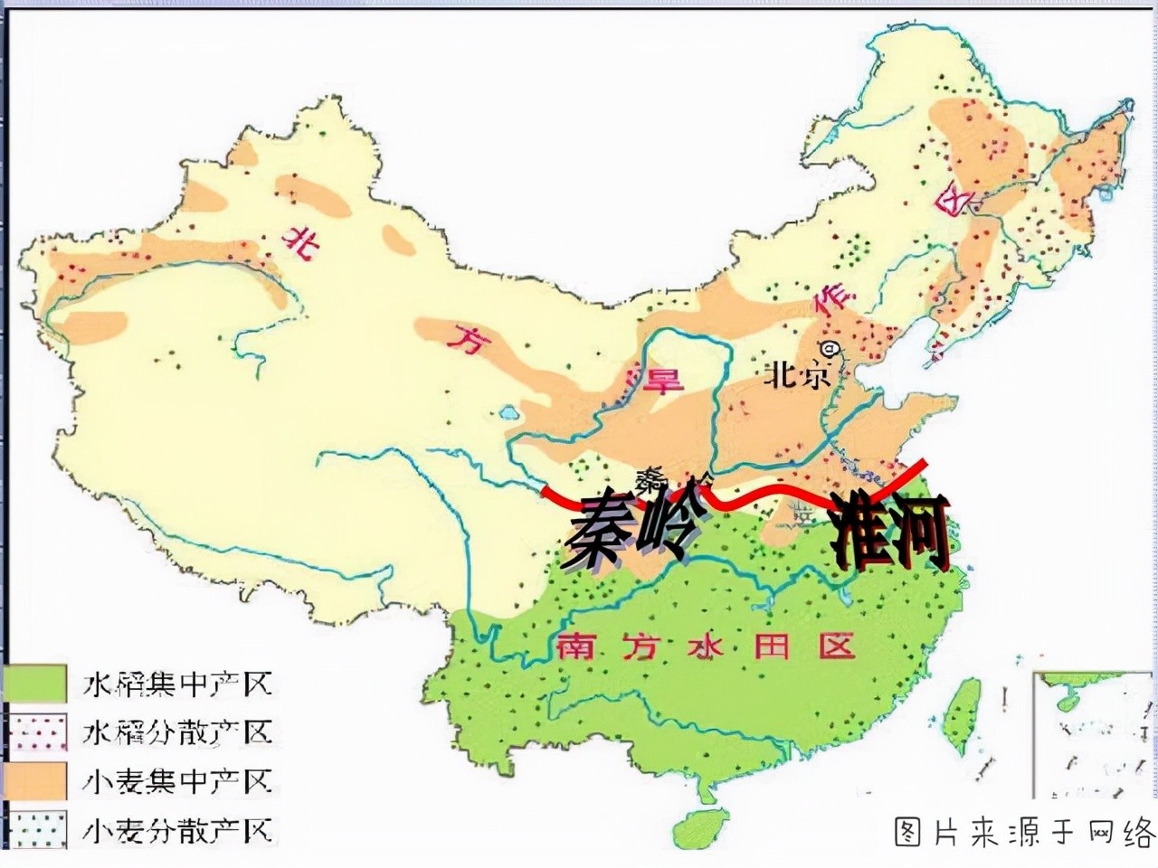 同时,在农业生产上,秦岭淮河以北的耕地以旱地为主,多产杂粮和小麦,以南的耕地以水田为主,农作物主要是水稻、玉米等等,另外在河流水文、植被、干湿状况等方面,秦岭淮河一线的南北方都有非常显著的差异,因此这条线一直是我们国家公认的南北分界线。