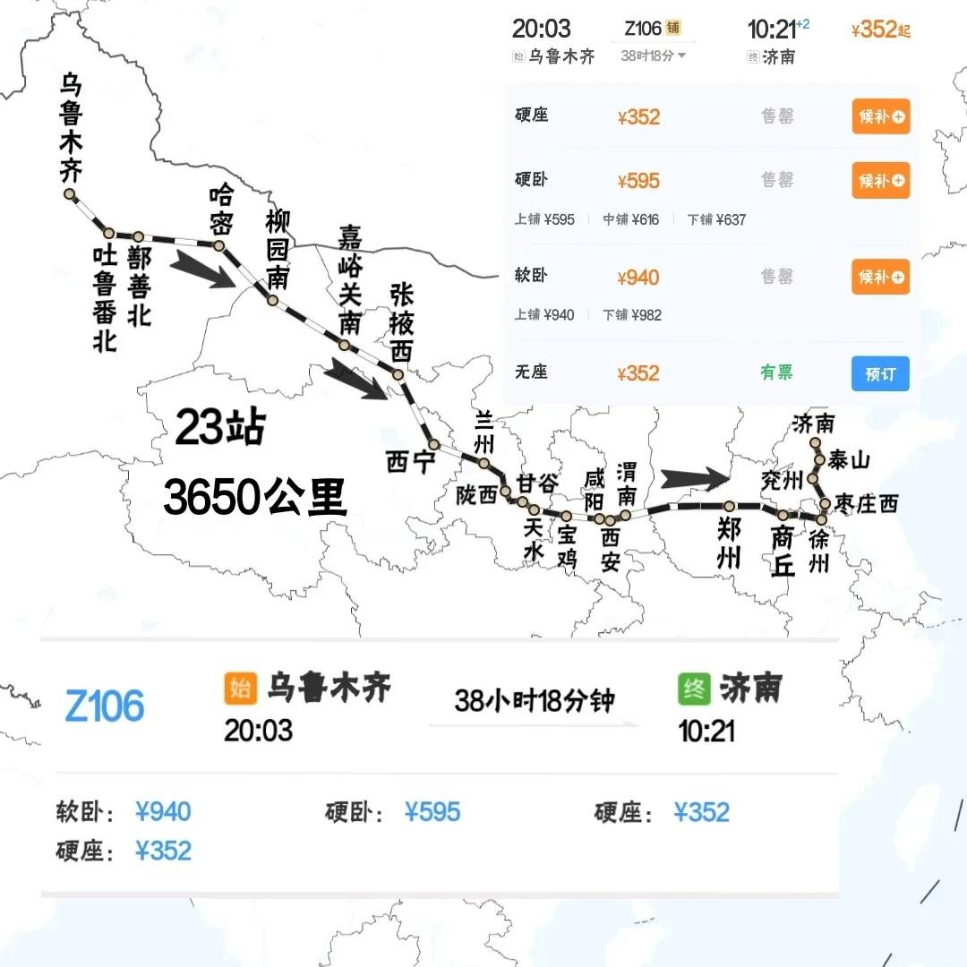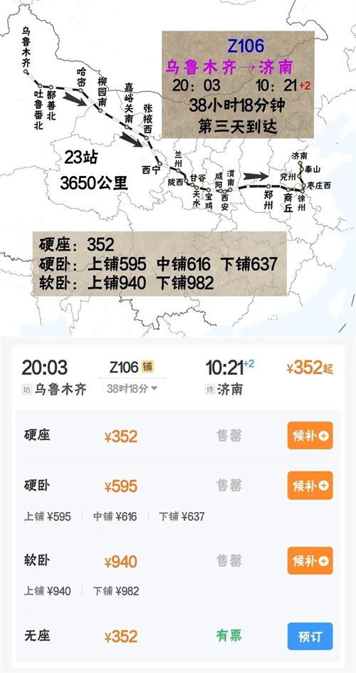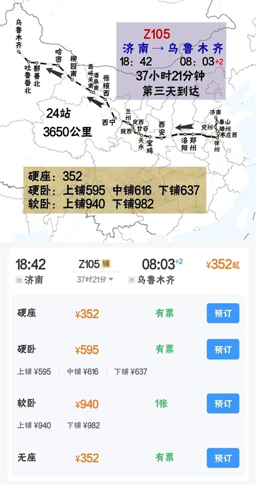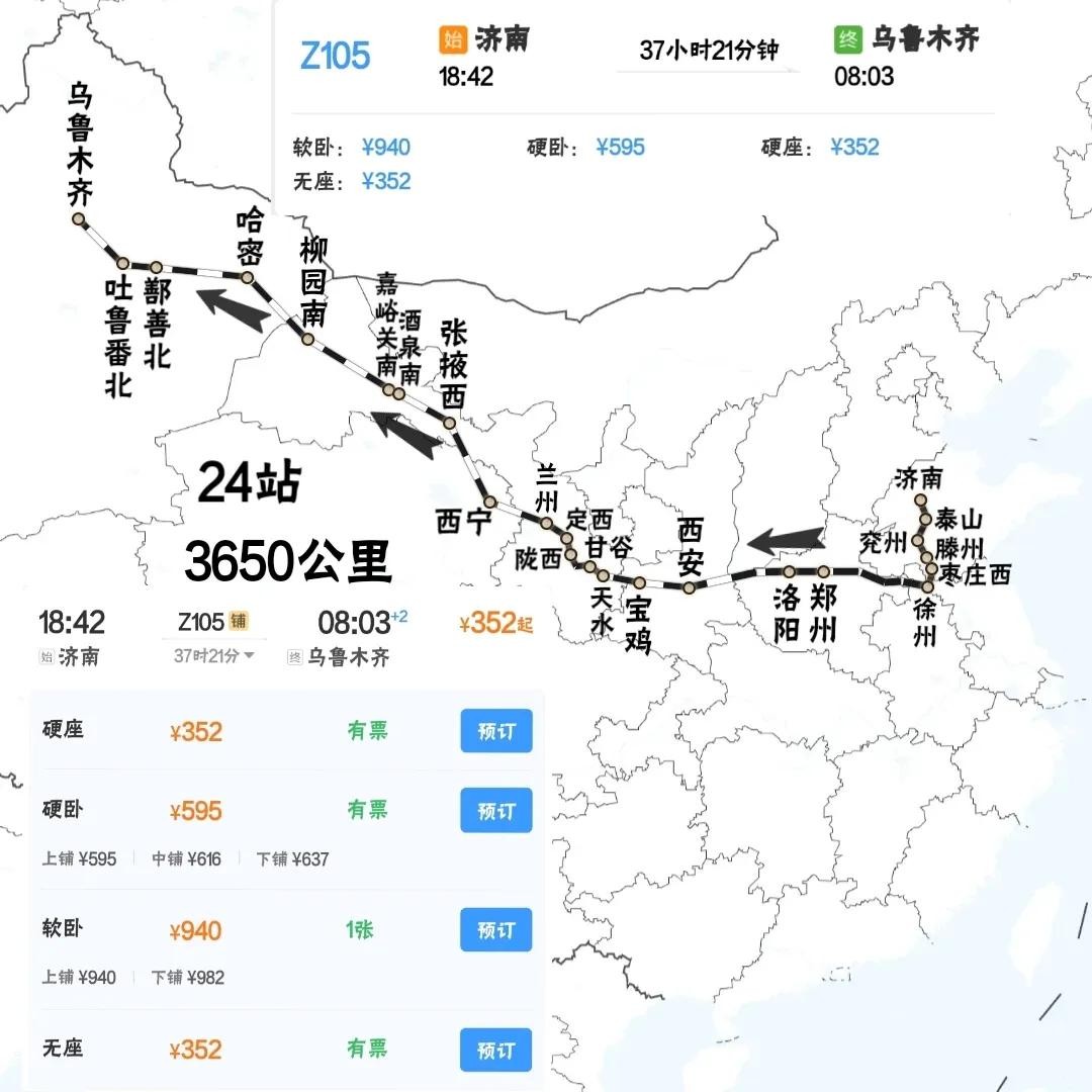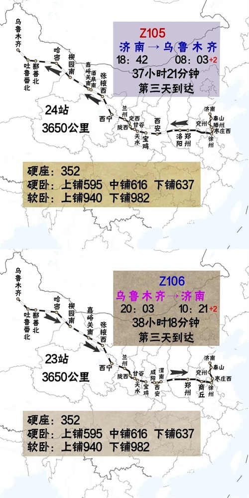 济南站开往乌鲁木齐站Z105次列车,历时37个小时,3650公里