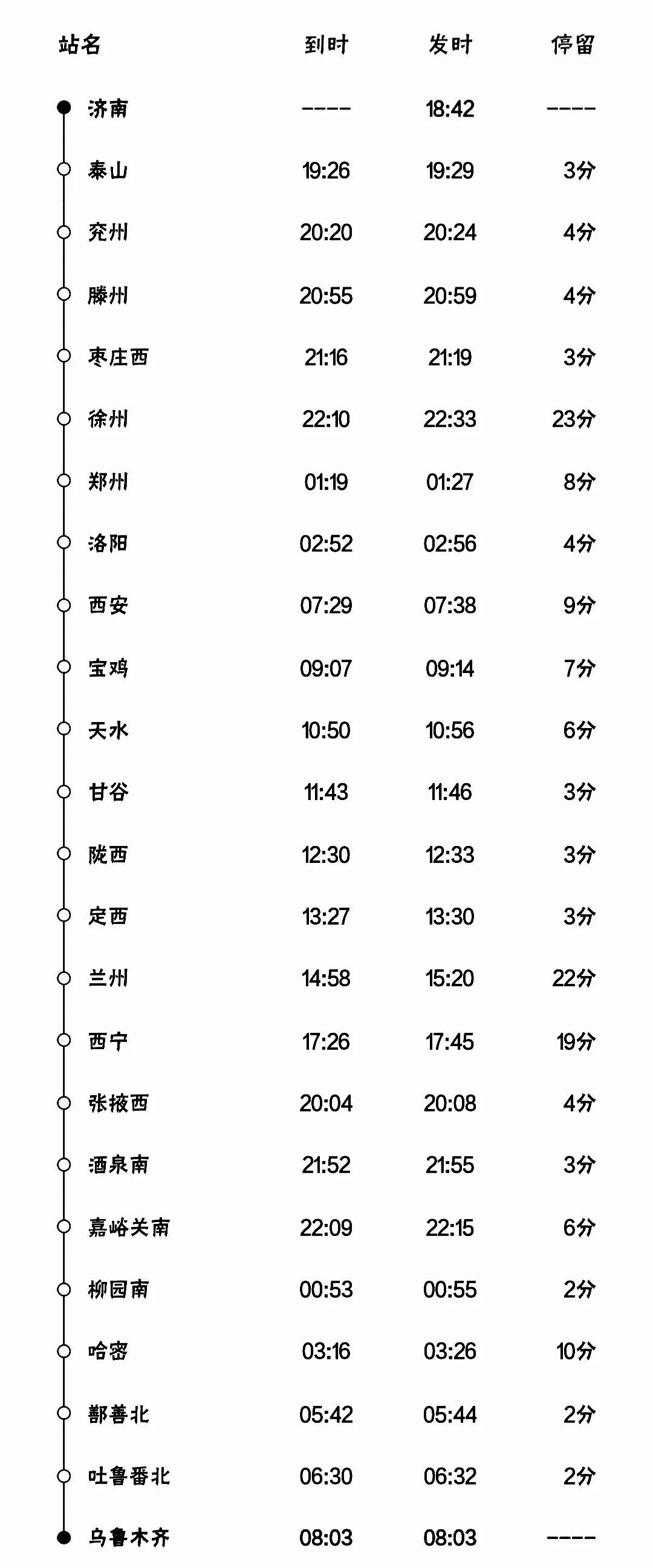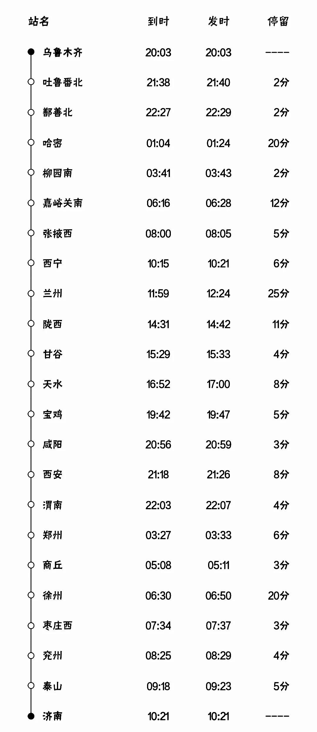 全程停靠车站是24个:济南、泰山、兖州、滕州、枣庄西、徐州、郑州、洛阳、西安、宝鸡、天水、甘谷、陇西、定西、兰州、西宁、张掖西、酒泉南、嘉峪关南、柳园南、哈密、鄯善北、吐鲁番北、乌鲁木齐。