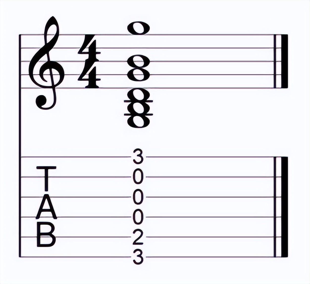 当你看到同一个音上排列了多个数字时,它往往是某个和弦,例如下图中六线谱显示的为G大三和弦。