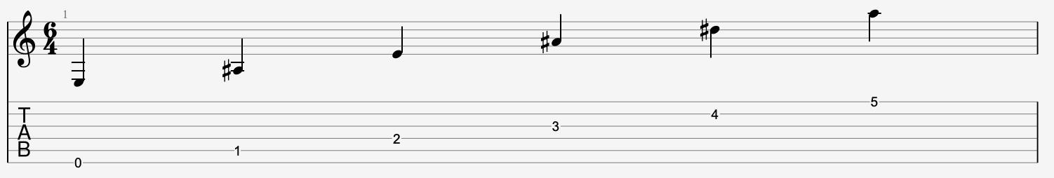 图中的第一个音,即为六弦的空弦,第二个音为五弦的一品,第三个音为四弦的二品。