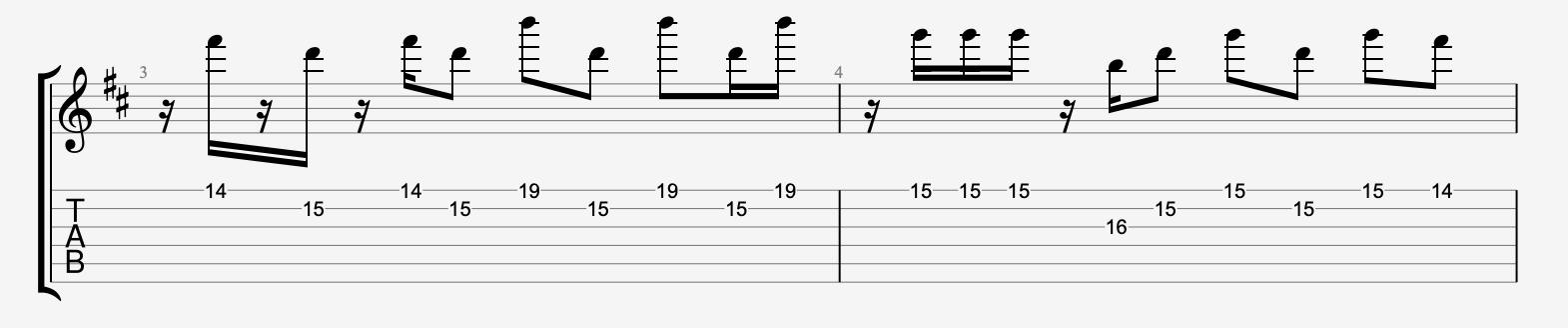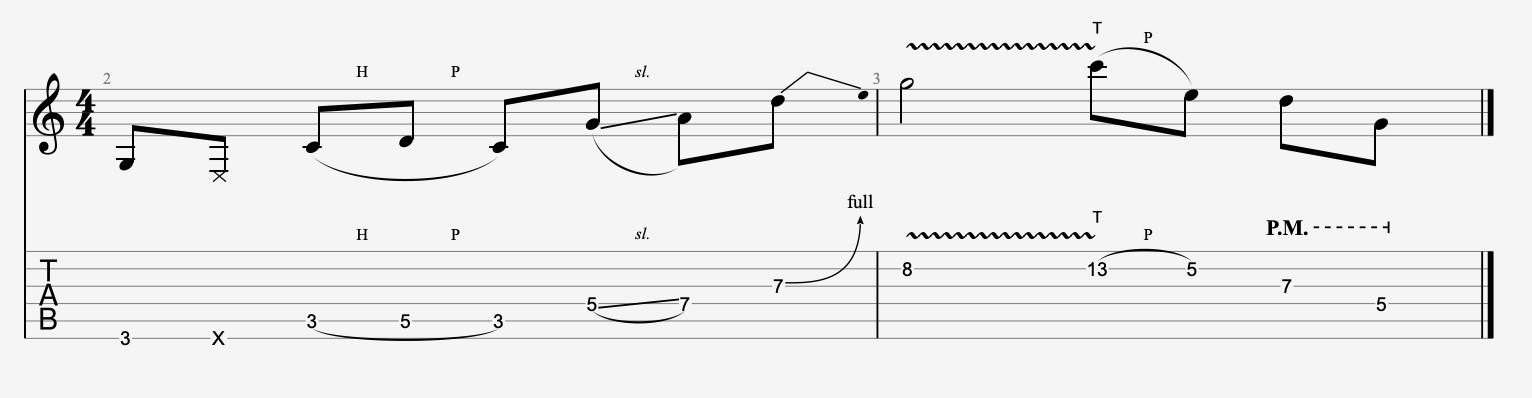 六线谱也会显示吉他的不同演奏技巧,例如下图的练习中便包含了多种技巧。