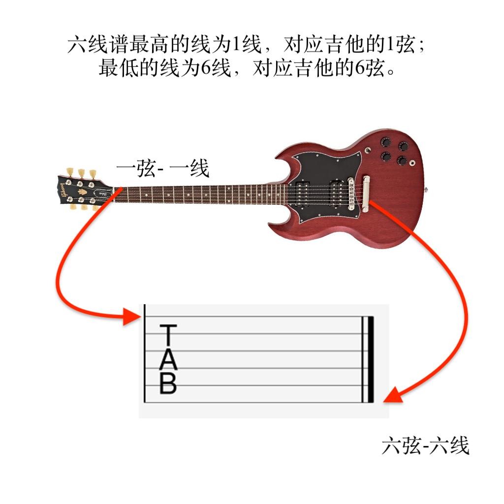 吉他一般有六根弦,六线谱的每一条线与吉他弦是相对应的,他们的关系为: