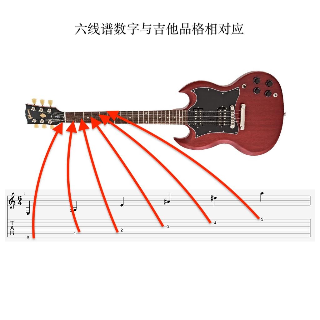 六线谱的数字对应了吉他的品格,比如“0”代表了空弦,“1”代表了1品,“2”代表了2品。