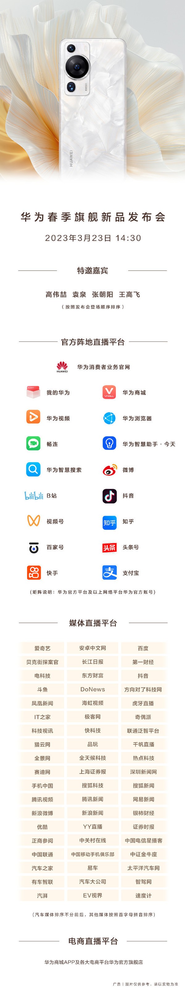 【手机中国新闻】华为春季旗舰新品发布会定档3月23日14:30,现在距离发布会正式举行只有1天时间了。随着发布会时间的临近,3月22日,华为公布了发布会直播平台及四位特邀嘉宾。