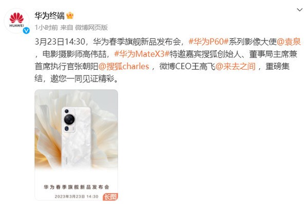 特邀嘉宾包括华为P60系列影像大使@袁泉 ,电影摄影师高伟喆,华为MateX3特邀嘉宾搜狐创始人、董事局主席兼首席执行官张朝阳@搜狐charles ,微博CEO王高飞@来去之间 ,重磅集结,邀您一同见证精彩。