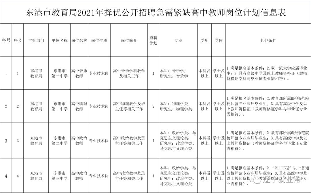 6.岗位所需要的其他条件,详见《东港市教育局2021年择优公开招聘急需紧缺高中教师岗位计划信息表》(附件1);