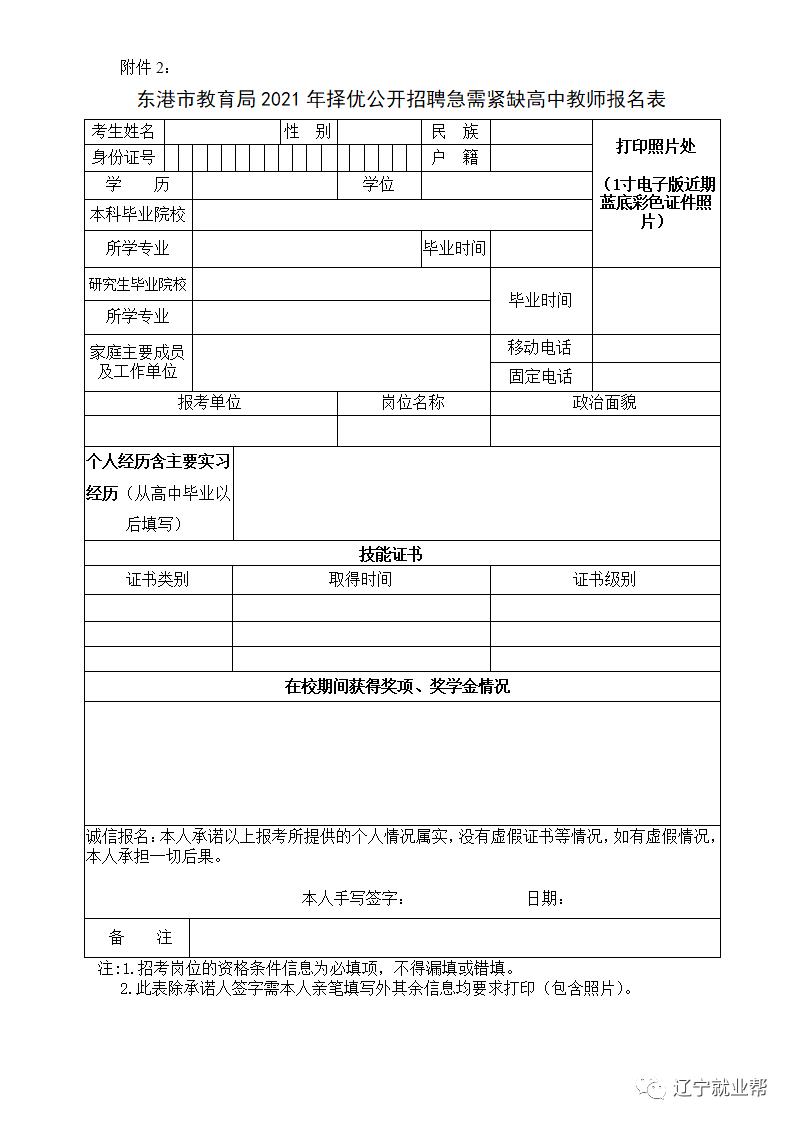 2.东港市教育局2021年择优公开招聘急需紧缺高中教师报名表