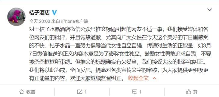 桔子酒店表示,3月7日微信推送的正文内容本意是为了褒奖女性独立,鼓励女性勇敢追求自我,不要被条条框框所束缚。但推文的标题确实有欠妥当,我们接受大家的批评和纠正。我们将以此为戒,全面反思,提高对各类宣传文字的审核,为大家提供更积极更有正能量的内容,欢迎大家继续监督纠正。