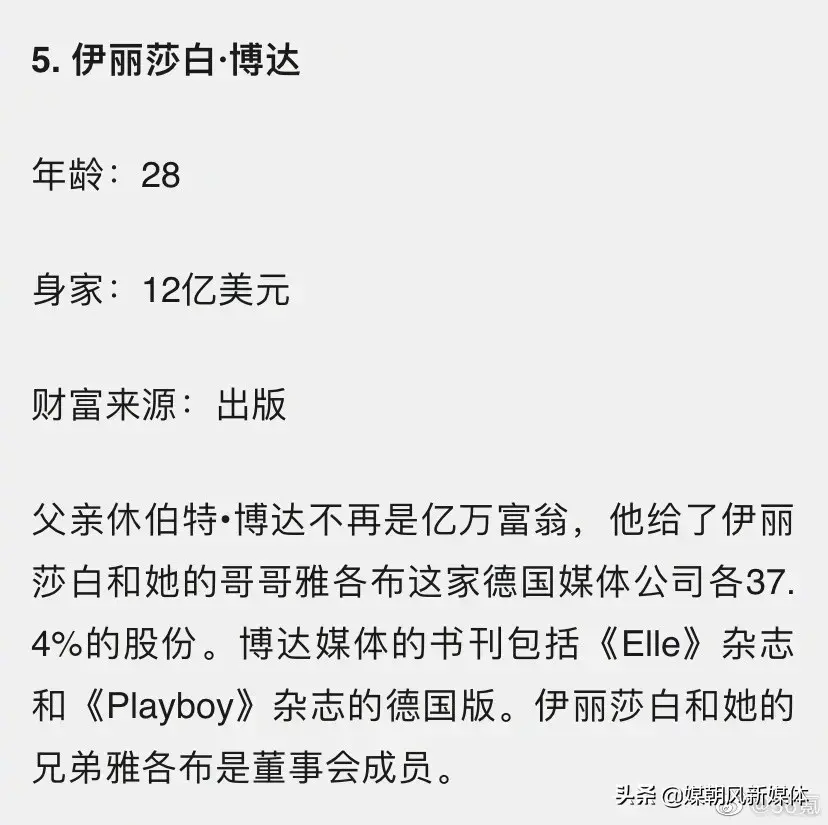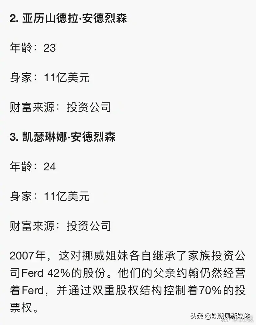 尽管全球市场行情因疫情下跌,今年仍有三名30岁以下的年轻人首次上榜。29岁的佩德罗·德·歌德尔·布埃诺继承了他的亿万富翁父亲的财产。第二位是29岁的莉莎·得雷克斯迈尔,她拥有德国汽车零部件生产商Fritz Draexlmaier Co & KG的控股公司。28岁的伊丽莎白·博达身价12亿美元,她的父亲休伯特·博达把家族媒体帝国37.4%的股份给了她。