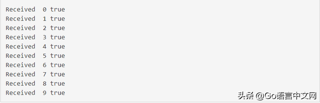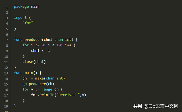 在第 16 行,for range 循环从信道 ch 接收数据,直到该信道关闭。一旦关闭了 ch,循环会自动结束。该程序会输出: