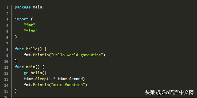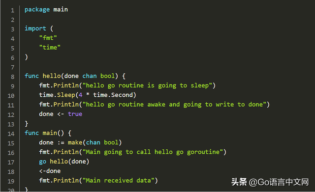 这是上一篇的代码。我们使用到了休眠,使 Go 主协程等待 hello 协程结束。如果你看不懂,建议你阅读上一教程 「GCTT 出品」Go 系列教程——21. Go 协程。
