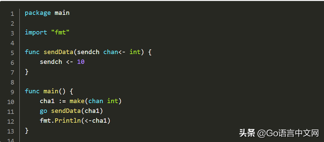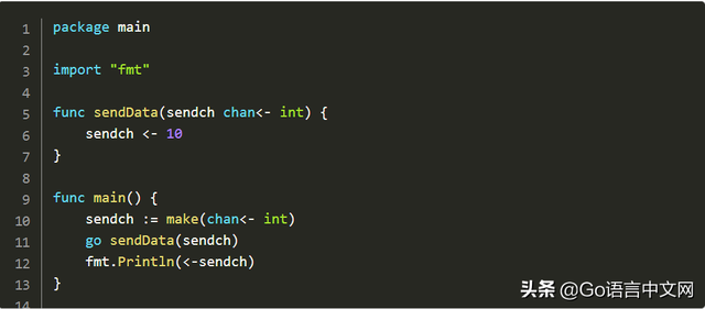 在上述程序的第 10 行,我们创建了一个双向信道 cha1。在第 11 行 cha1 作为参数传递给了 sendData 协程。在第 5 行,函数 sendData 里的参数 sendch chan<- int 把 cha1 转换为一个唯送信道。于是该信道在 sendData 协程里是一个唯送信道,而在 Go 主协程里是一个双向信道。该程序最终打印输出 10。