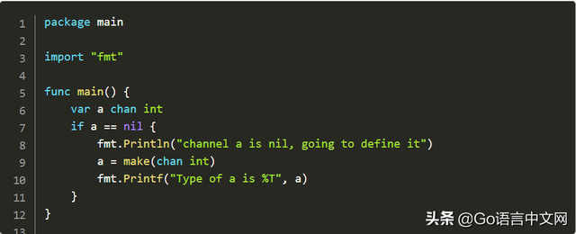 由于信道的零值为 nil,在第 6 行,信道 a 的值就是 nil。于是,程序执行了 if 语句内的语句,定义了信道 a。程序中 a 是一个 int 类型的信道。该程序会输出: