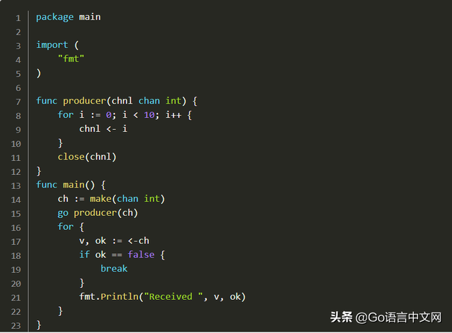 在上述的程序中,producer 协程会从 0 到 9 写入信道 chn1,然后关闭该信道。主函数有一个无限的 for 循环(第 16 行),使用变量 ok(第 18 行)检查信道是否已经关闭。如果 ok 等于 false,说明信道已经关闭,于是退出 for 循环。如果 ok 等于 true,会打印出接收到的值和 ok 的值。