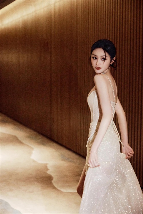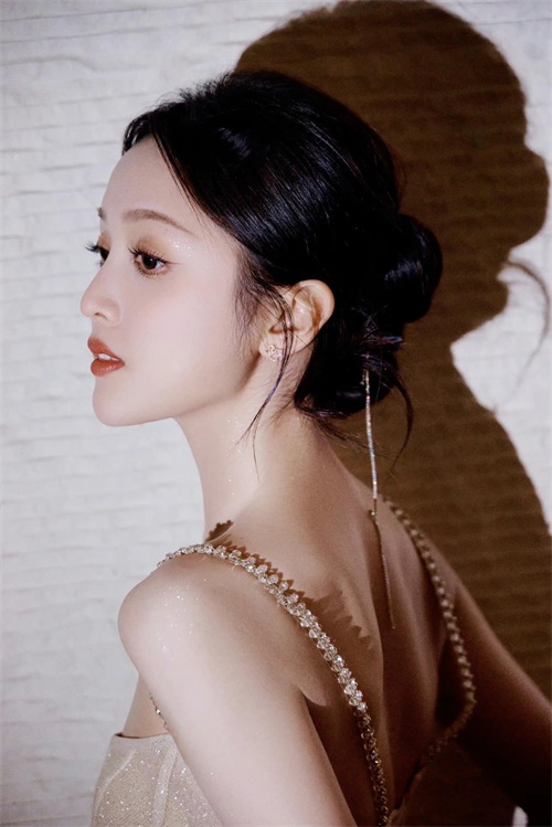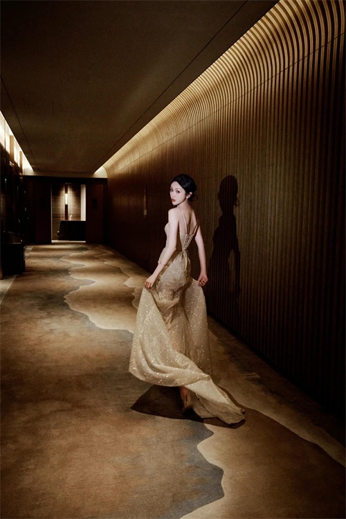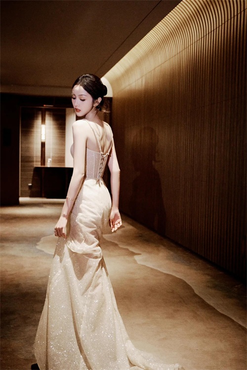 裙上鎏金细闪好璀璨华丽,明亮夺目,好似星河汇聚她身。