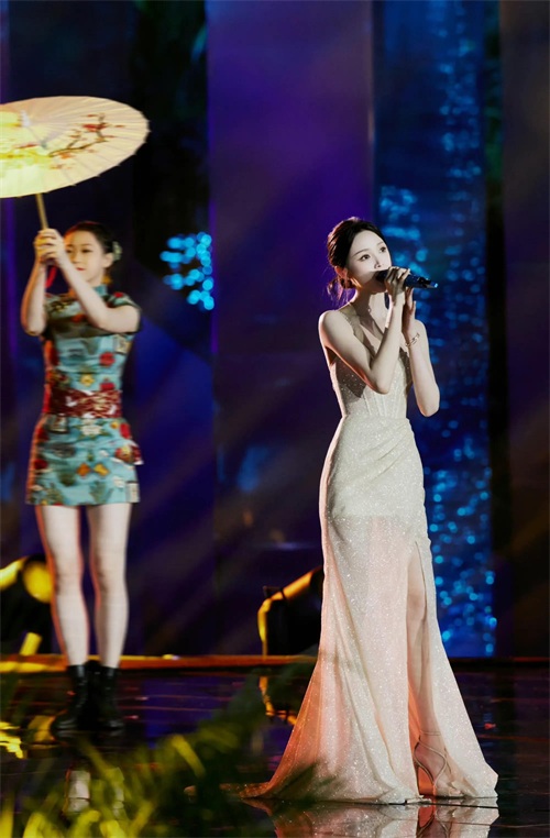 吴宣仪在舞台上高歌一曲,身姿高挑又窈窕。