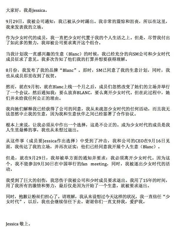 2014年9月30日,Jessica在微博上传了一份韩英双版的内容:“正在期待并准备即将到来的粉丝见面会,结果却从公司及8名成员那里收到通知,说从今天起我不再是少女时代的成员。感到很震惊和无比的失望。我现在一切的工作都以少女时代活动为先,并全身心投入其中,但是踢我没有合理的理由,我是被强迫退出的。”