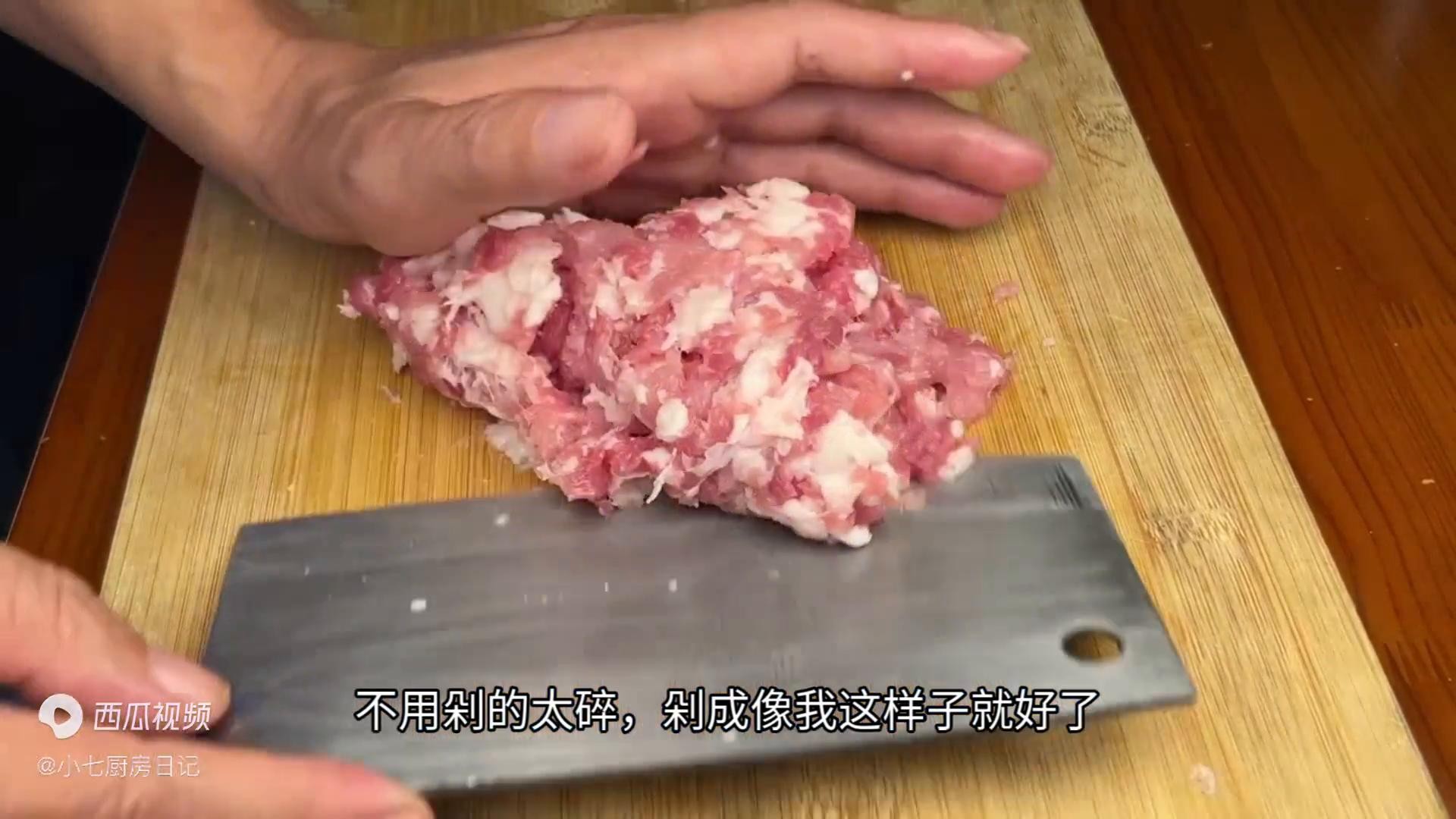 2. 接下来准备一块新鲜的猪肉,先切成小块,再剁成肉末,不用剁得太碎,剁成像我这样子就好了,剁好后放碗里备用。