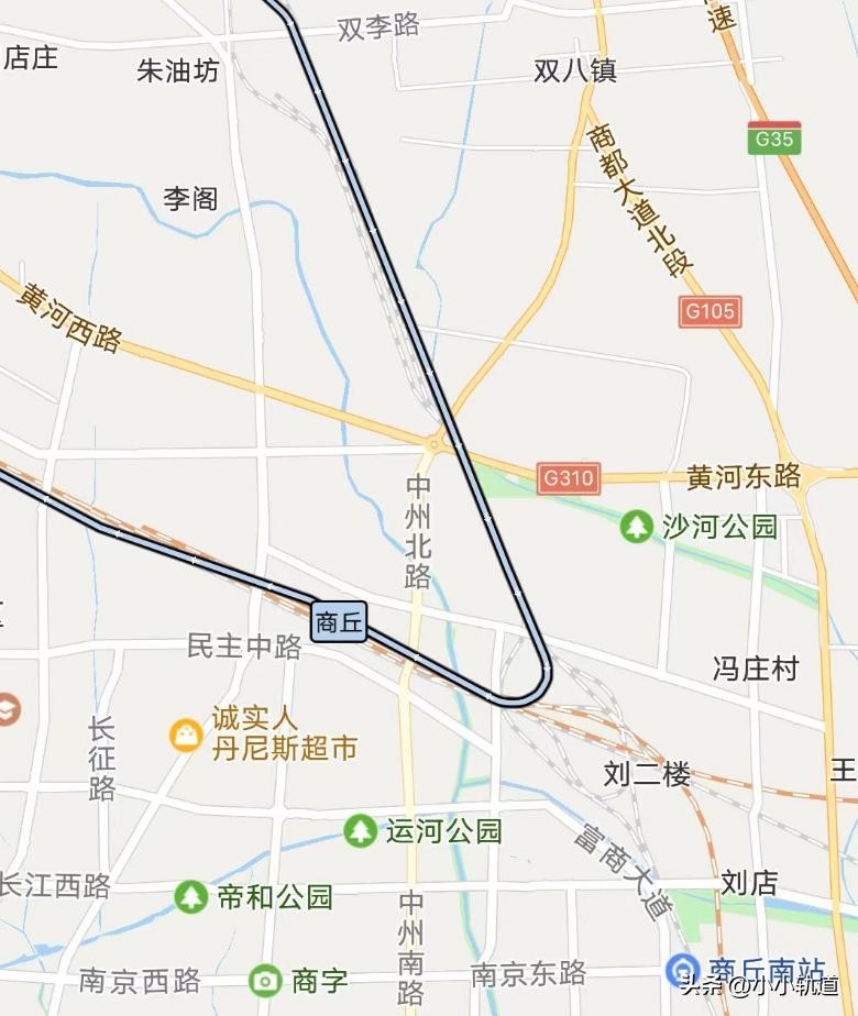 K1305次列车在商丘站停靠13分钟,列车由北向南行驶,在商丘向西45度转向,向开封驶去。